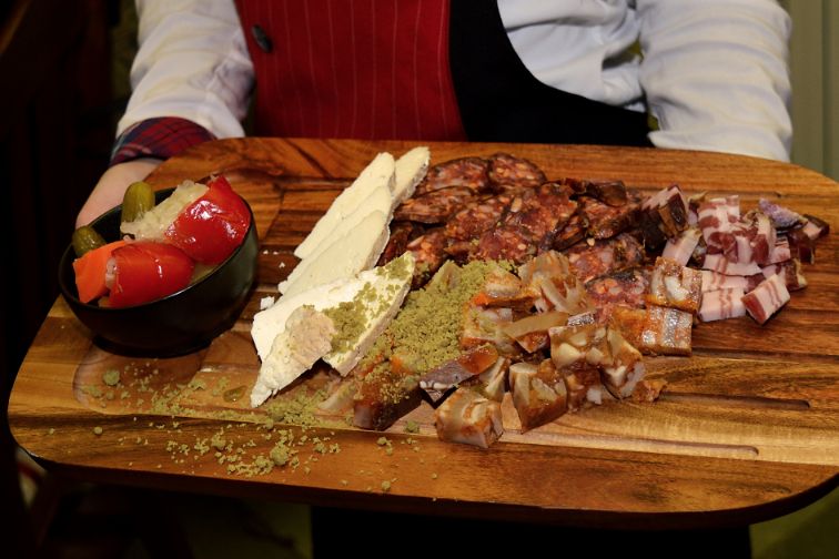Predjelo: Dobrote turopoljske pušnice s domaćim kiselišem (špek, švargla i kobasica od turopoljske svinje, sir s lokalnog OPG-a, prah od bučinog ulja i kiselo povrće)