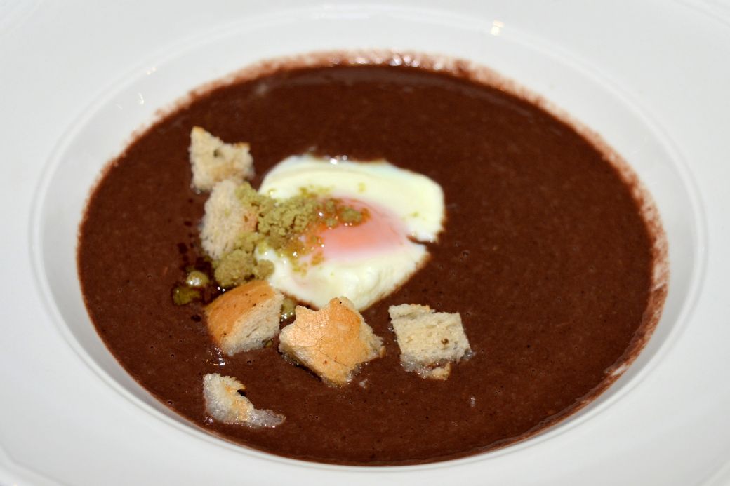Juha: Kremasta juha od krvavice s ječmenom kašom i poširanim jajetom